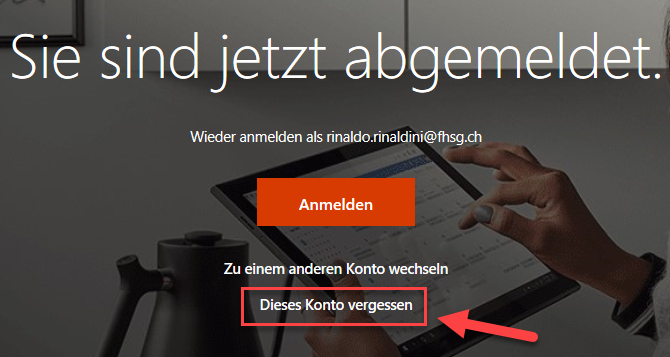 Falls du schon mit einem anderen Office 365 Account angemeldet bist, musst du dich zuerst abmelden. Danach kannst du auf Dieses Konto vergessen klicken und dich wieder anmelden: