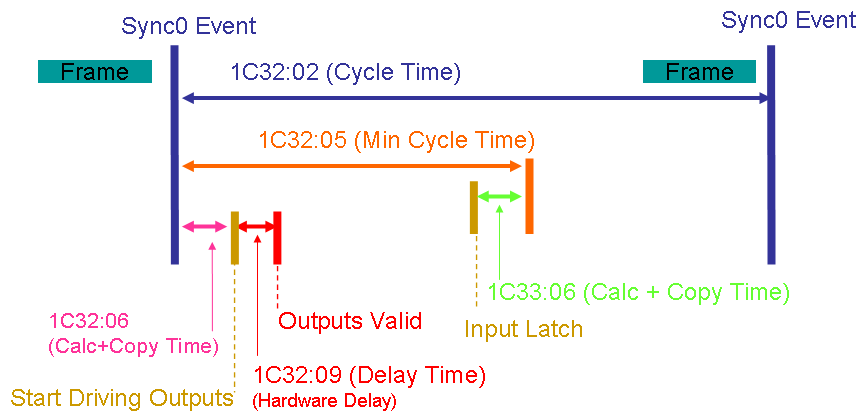 The Sync0 event ist triggered on all devices of the network at the same time. The slaves can read inputs and set outputs after a deterministic and configurable time (1C32:06 + 1C32:09) after the Sync0 event. Thus it is possible that all outputs in the whole network are set simultaneously within nanoseconds. The same is true for reading inputs at a determenistic time. It is also possible to set the outputs with a desired time delay.
