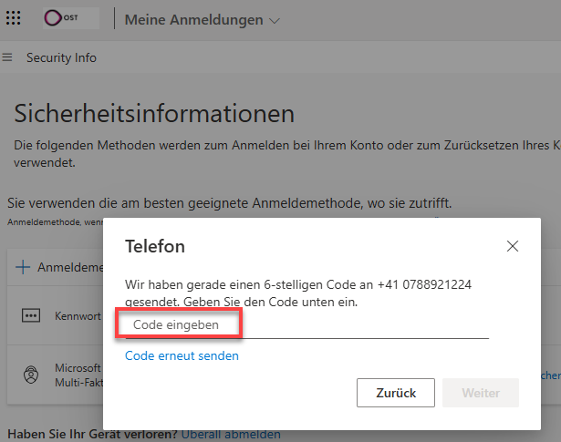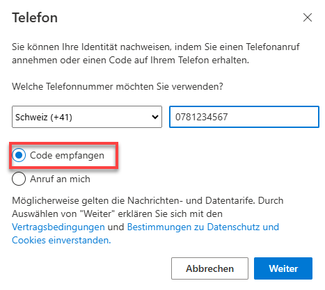 Wir empfehlen, als Authentifizierungsmethode eine alternative Telefonnummer (z.B. Mobilnummer der Freundin oder des Freundes) zu hinterlegen. Falls du dein Smartphone einmal vergessen haben solltest, kannst du den Bestätigungscode an diese Nummer schicken. Du benötigst dazu den Zugriff auf das Telefon.