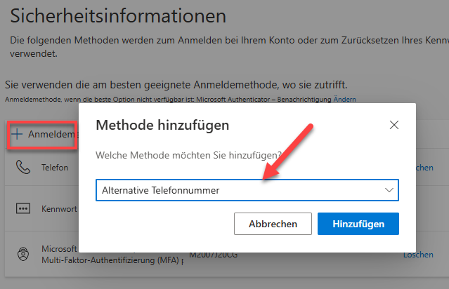 • Klicke auf Anmeldemethode hinzufügen, wähle im Dropdown Menü Alternative Telefonnummer aus und Hinzufügen
